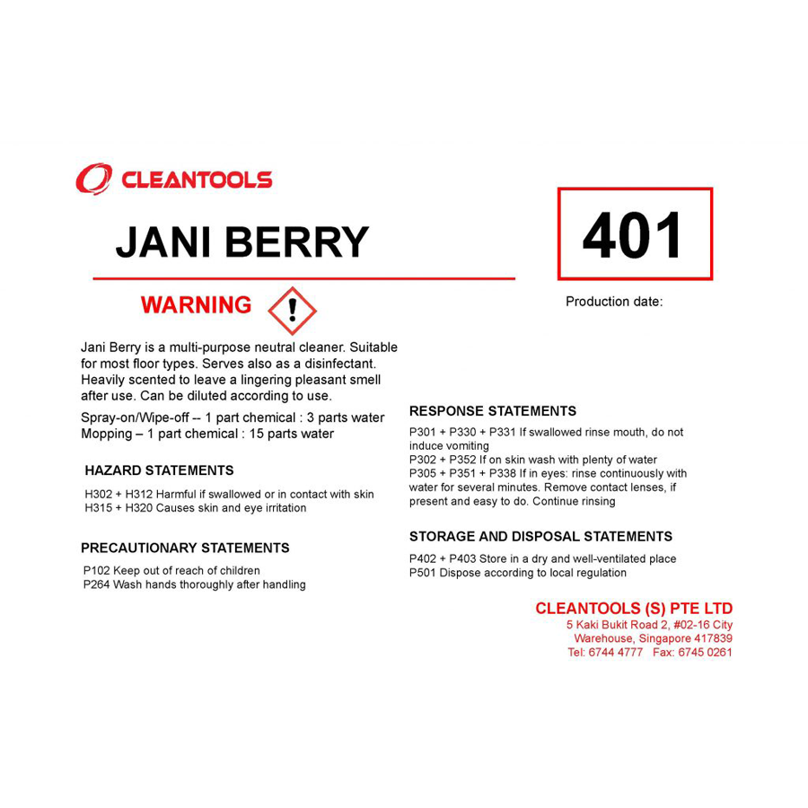 Jani Berry is a multi-purpose neutral cleaner. Suitable for most floor types. Serves also as a disinfectant. Heavily scented to leave a lingering pleasant smell after use.